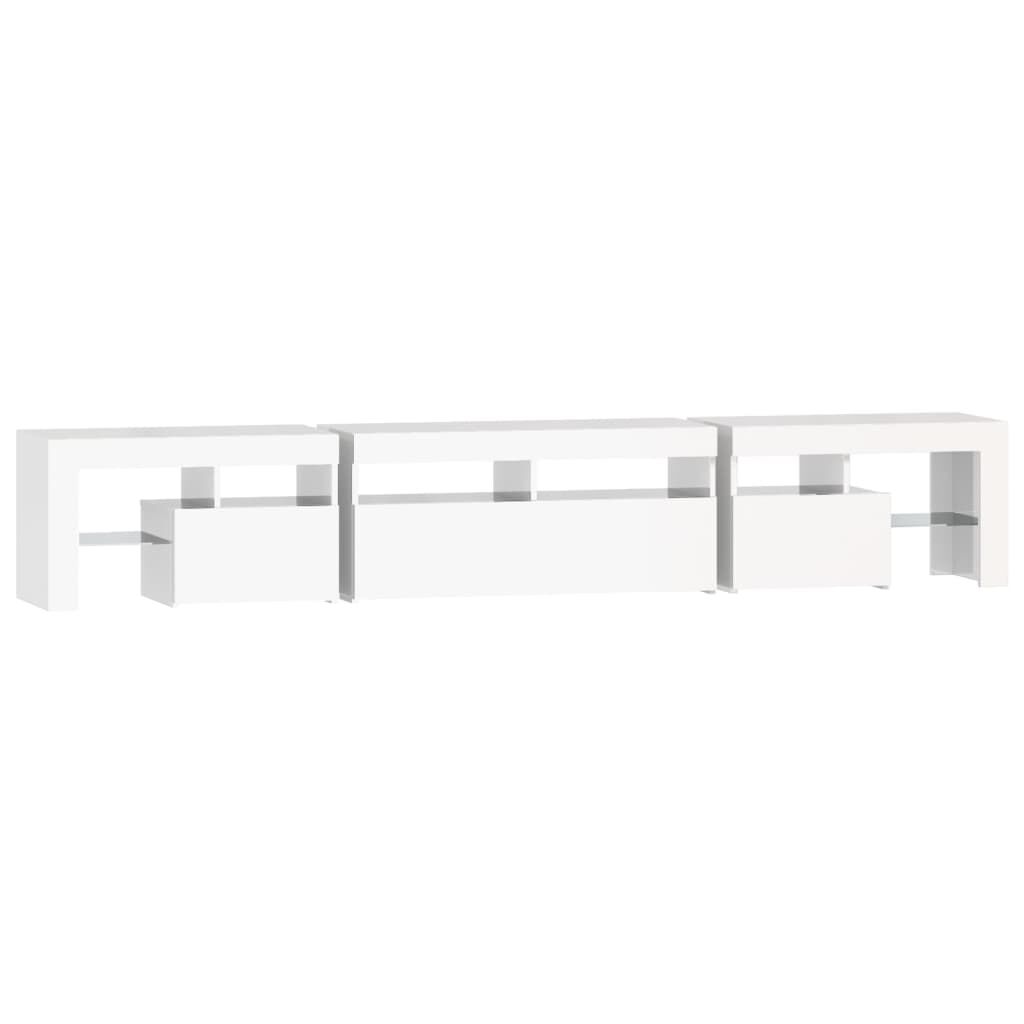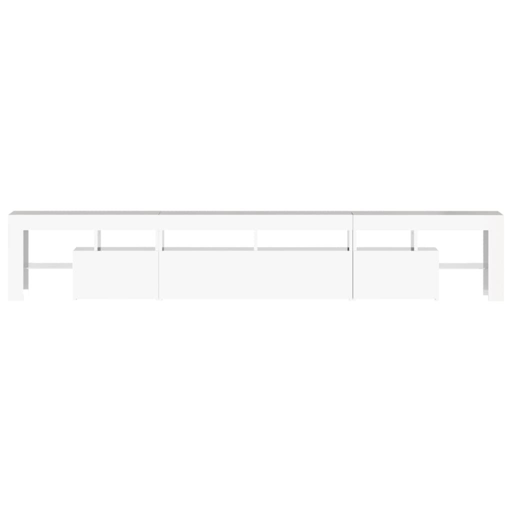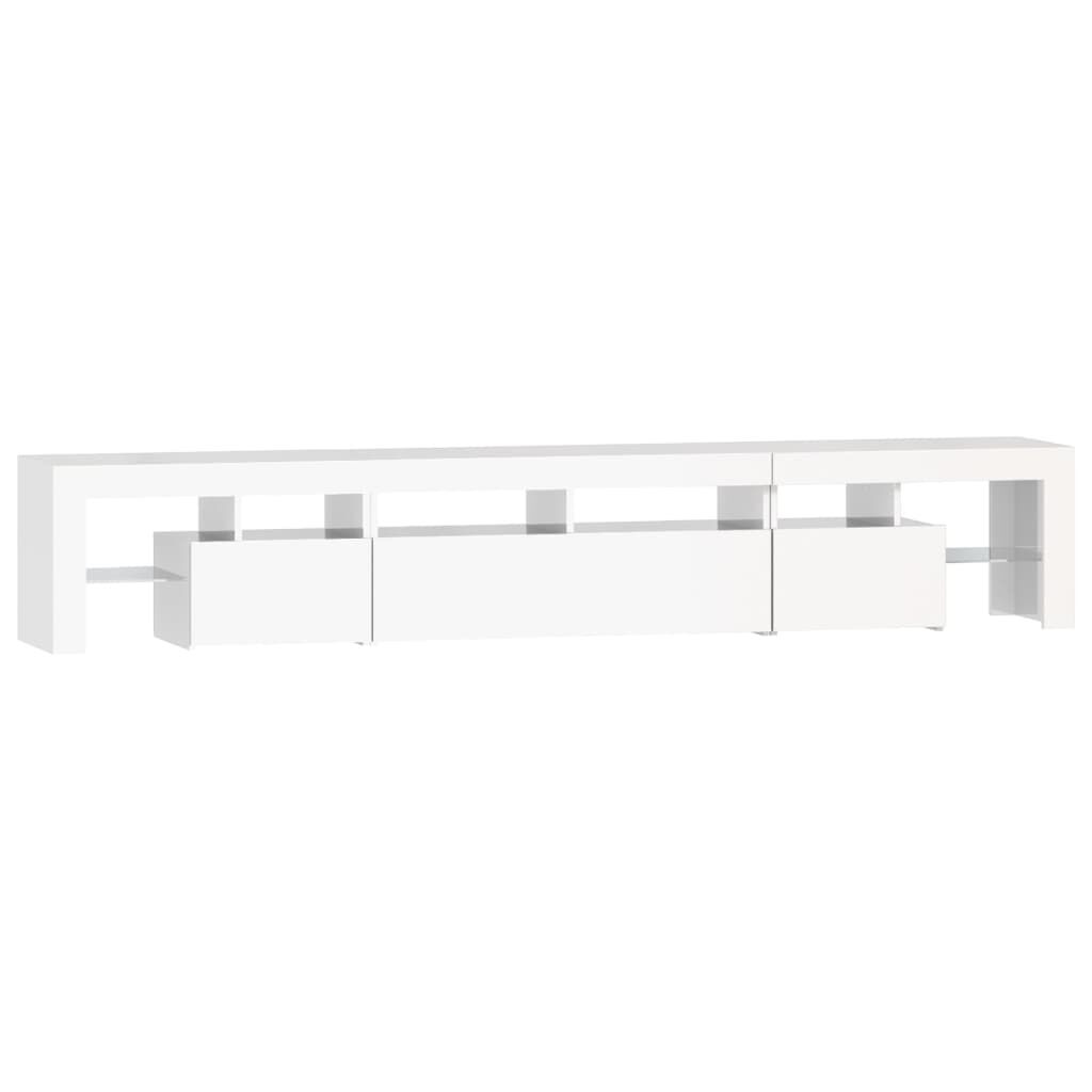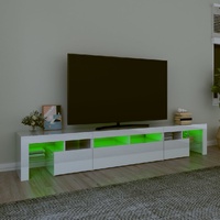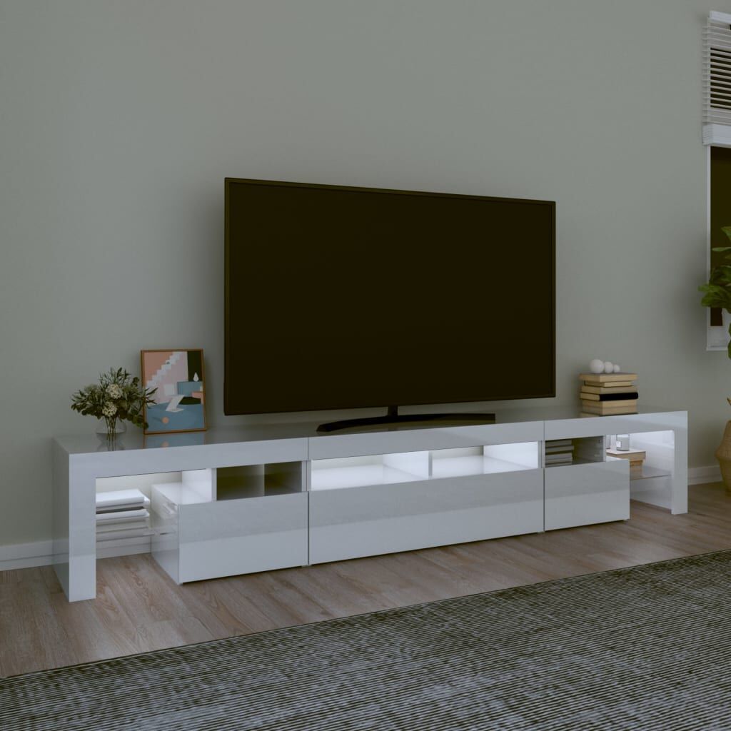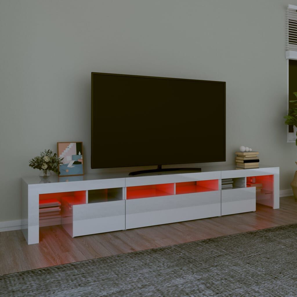 Featuring a trendy yet practical design, this TV cabinet with LED lights definitely becomes a focal point of your room. Practical material: The engineered wood is of exceptional quality with smooth surface and also features strength, stability and resistance to moisture. Colourful LED lights: The TV stand features RGB LED lights, which has different menus to change the colour of lights and let the colour adjust automatically differently. The LED lights underline the modern look and contribute to the trendy feeling.Ample storage space: The TV unit provides plenty of storage space for keeping your magazines, books, remote controls and other small items well-organised and within easy reach.Displaying function: The sturdy top of media cabinet is ideal for displaying decorative objects, photo frames, or potted plants. Note:The product has a USB connector, but the certified 5V USB power source is not included.Each product comes with an assembly manual in the box for easy assembly.