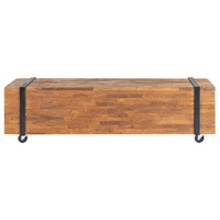 This classic wooden TV stand features a unique industrial style, making it a great addition to your living room or entertainment area. It is also perfect as a coffee table, sideboard or low board. This sturdy and robust TV unit is crafted from teak hardwood to look like a stack of beams held together by a pair of black belts. Its sturdy top has ample space for your TV or vases, potted plants, fruit baskets, and other decorative items. The natural finish makes the TV rack easy to clean. Thanks to its four wheels, it is also easy to move around. Good to know:Colours and grains vary per furniture item, making each piece unique. The delivery is random.