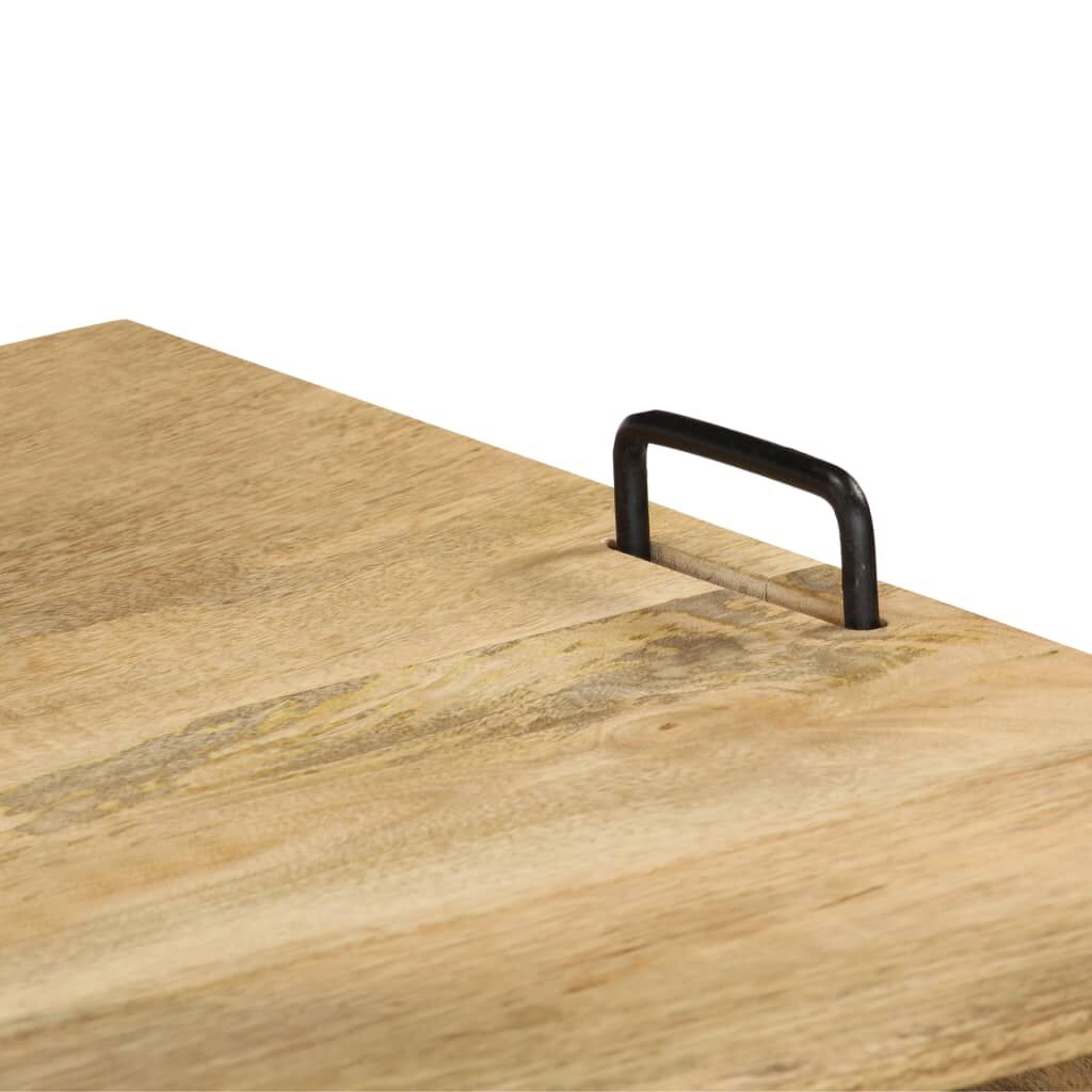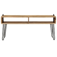 The wooden TV stand will make a timeless addition to your living room decor. Constructed from solid mango wood and sturdy steel frames, the HiFi cabinet is highly stable and durable. The top is ideal for placing your TV or stereo systems as well as some decorative items like vases and potted plants. The shelf provides extra storage space for keeping your DVD players, game consoles, streaming devices, media carriers, etc. neatly organised. The steel frames add to the stand's sturdiness as well as to its industrial style. Every step of the construction process is carried out with the greatest care, be it polishing and lacquering. The TV stand is easy to assemble. Important note: The colours and grains of the wood may vary from piece to piece, making each piece unique and slightly different from the next. The delivery is random, ensuring the exclusivity and individuality of your product.