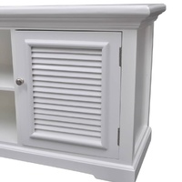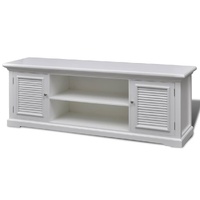This elegant wooden TV stand in antique look with clean lines is a perfect addition to nearly any interior style, from ultra-modern lofts to casual family rooms. It will add a touch of style to your home theater set-up. The TV console has four shelves with two doors, which provide out-of-sight storage for games, movies, music and other entertainment essentials. A further two shelves can accommodate different home entertainment systems, such as CD players, DVD players and DVR systems. The wide top surface of this TV cabinet makes it ideally suitable for showcasing a freestanding wide screen plasma or LCD television. Made from sturdy MDF and pine wood, the TV stand holds up well to everyday wear and tear. The white paint finish makes it easy to clean with a damp cloth.