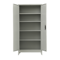 It has four internal metal shelves that define 5 storage spaces, a bottom with lateral and central reinforcement, metal hinges, and galvanised pins in inconspicuous places, and a safety lock with 2 anti-keys. The 4 inner shelves they are placed on clips so they can be easily replaced. It features 2 opening doors that provide full visibility and access to the interior of the cabinet.