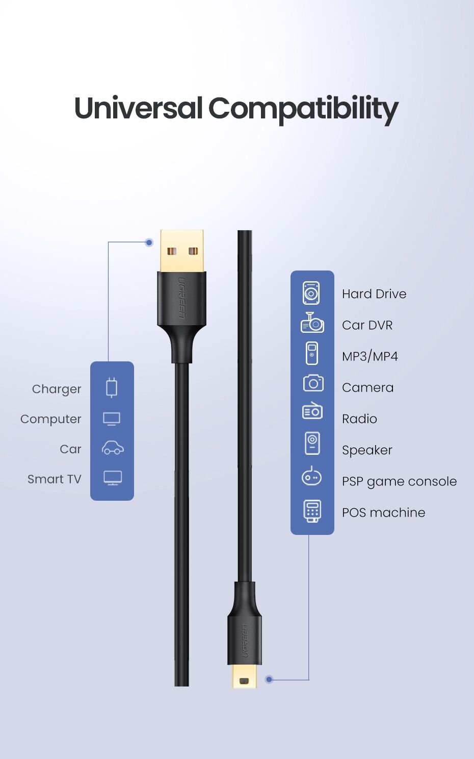 Mini USB 2.0 cable is compatible for GoPro HERO HD, HERO 3+, PS3 controller, Astro A40/50, MP3 players, HTC, Digital Cameras like Canon, Sat Navigation, Garmin GPS Receiver, Zoom Mic, Dash Cam etc and other devices with Mini 5 Pin connector.