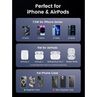 The wireless charging station for multiple devices is compatible with iPhone 15/15 Pro/15 Pro Max/14/13/12 series (7.5W for iPhone Series), AirPods Pro 2/1, AirPods3/2, Galaxy Buds, and most Qi-supporting devices. NOTE: For better charging, it is recommended to use a MagSafe phone case or a bare phone; Airpods 1 is not supported. For other types of Airpods, please ensure that it has the wireless charging case instead of the lightning case.