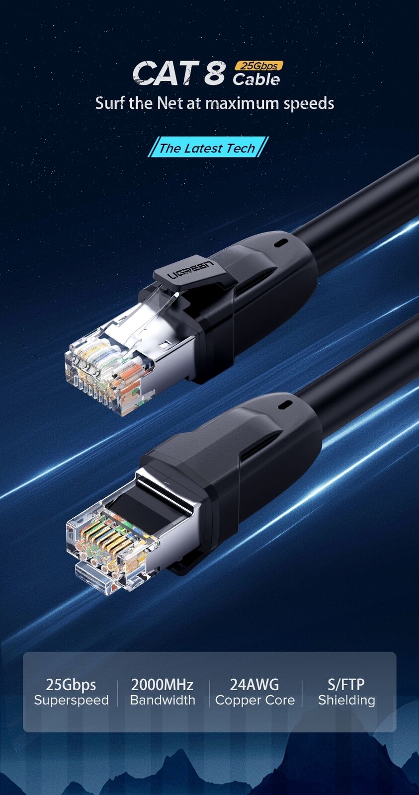 With the RJ45 connectors, UGREEN Cat 8 internet cables is universally compatible with networking switches, computers, laptops, routers, ADSL, network adapters, hubs, modems, PS5, PS4, X-box 360, X-Box One, Switch, patch panels and other networking devices.