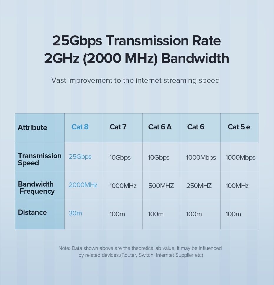 This UGREEN Cat 8 Ethernet cable supports speeds up to 40Gbps and bandwidths of 2000MHz when match with devices that also support 5Gbps and above. Bring you a super-smooth network when regular browsing, uploading and downloading, online gaming and HD video streaming, etc.