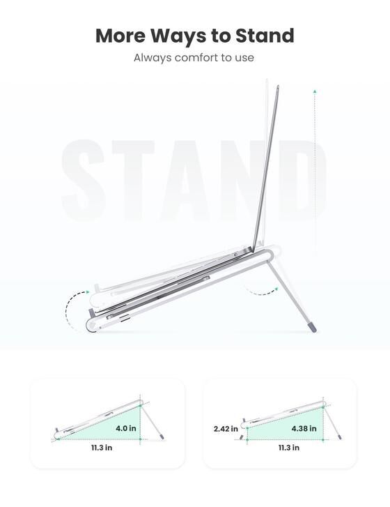 UGREEN laptop stand can be adjusted to 2 comfortable angles and heights. Adjustable Height: 4 inch and 4.38 inch. It raises your laptop to a perfect eye level and minimizes neck fatigue, back pain and eye fatigue. The ergonomic design makes it quite easy for watching videos and typing, suitable for the designer, engineer, programmer and the people who work long hours in front of the laptop.