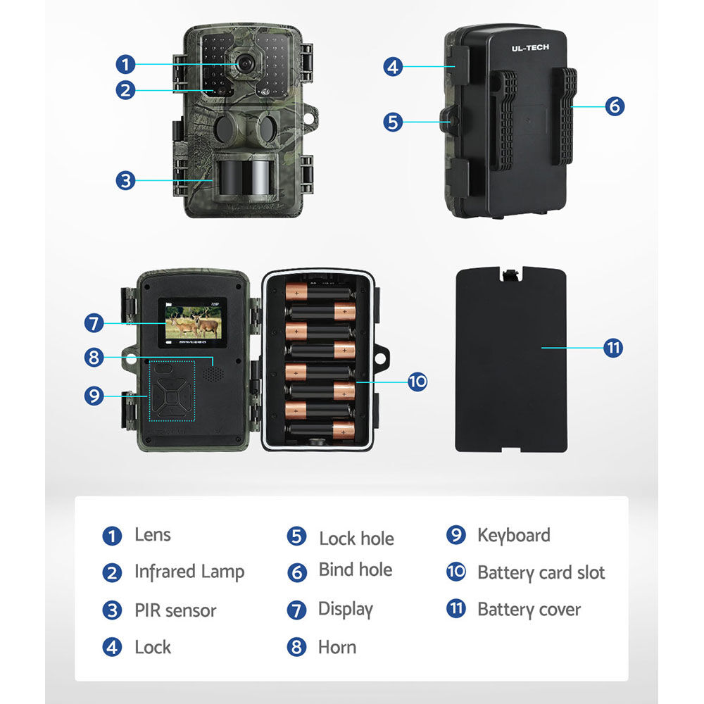 Capture the beauty of nature in razor-sharp focus with a UL-tech Trail Camera. With clear 16MP picture quality and 4K full HD video, you can capture the full spectrum of wild animals, plants and natural phenomena in any weather conditions, from anywhere, anytime. There are multiple ways to record in multiple scenarios, whether you are recording out in nature, on your farm, or at home for security. The camera features 42 high-quality infrared LEDs that are activated immediately when they detect a change in light settings, so you can have clear night vision that will not alert nearby animals. Pick up any activity immediately with the sensitive PIR motion detection. It has a fast 0.5s trigger speed and allows for time-lapse shooting so you can capture every moment. The camera is IP66-certified waterproof for use in any weather and is resistant to cold, heat, dust and even lightning. It has room for up to 8 AA batteries giving it a standby time of up to 6 months of low power consumption and supports microSD cards of up to 32GB storage for long-term recording. Supports 11 operating languages so you can choose the best support for your area. Best of all, the device is easy to install and blends into the environment thanks to its camouflage design. Observe nature in its purest form with a UL-tech Trail Camera.