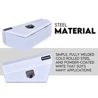 Similar to its flat plate under tray toolbox and plate aluminium flat counterpart, it is built with super-heavy duty steel. Secure this white powder coated toolbox on the underbody of your truck or UTE for maximum strength and secure extra storage space.