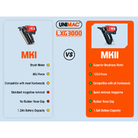 UNIMAC nailers are synonymous with enduring performance and the LXG3000 MkII embodies this reputation like no other. This second generation model introduces a number of upgrades on the popular original nailer. It now has a brushless motor with 20 more joules of force to power through all hardwoods. The two supplied lithium batteries now have an even longer life, with each providing 2,800 shots per charge. The addition of a rubber nose cap ensures your workpieces will not be marked.