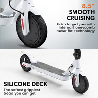 The large 8.5-inch tyres with internal honeycomb technology ensure a smooth ride, predictable handling and the benefit of never risking a puncture or requiring refilling with air!
