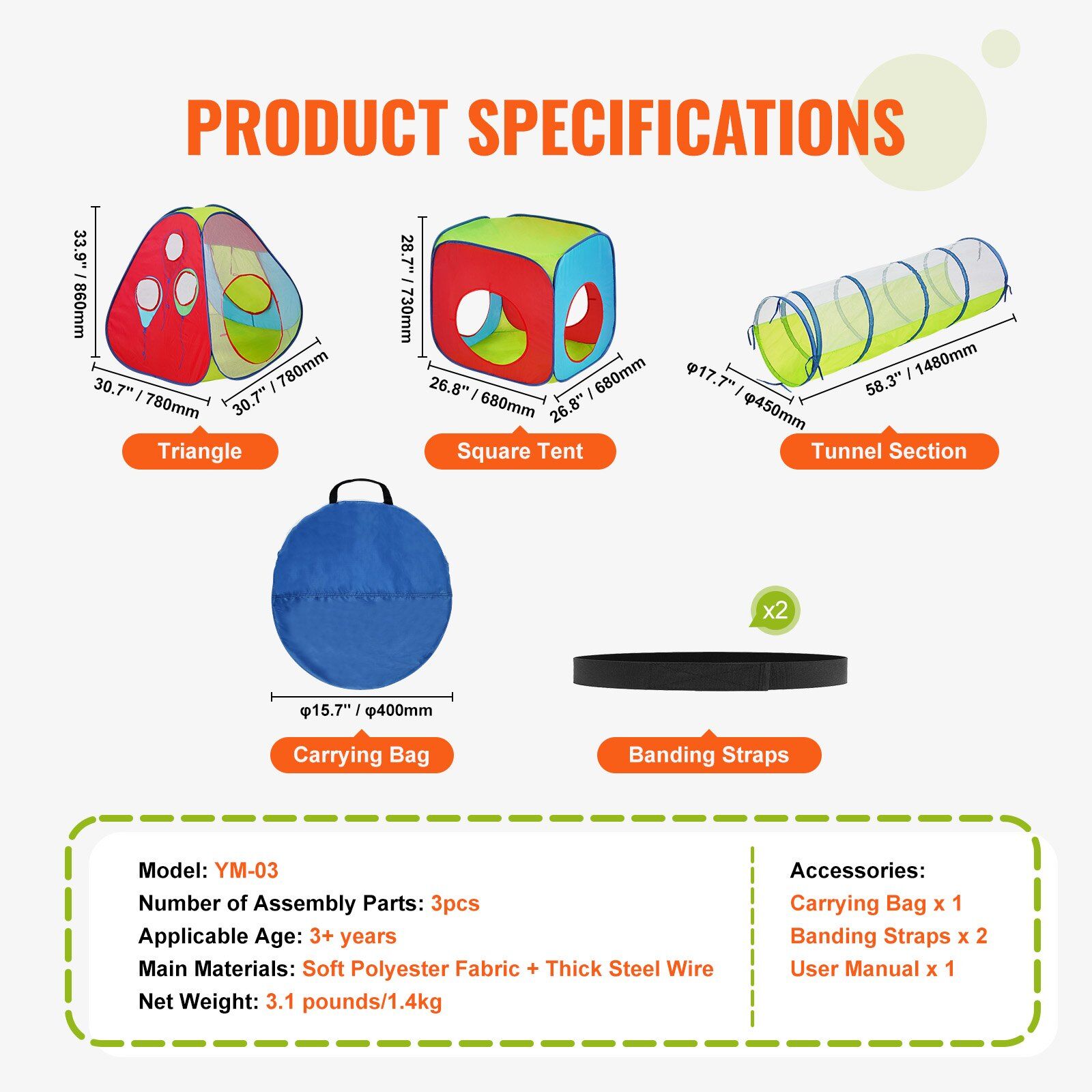The vibrant and bright colors are designed to capture children's attention and ignite their imagination. With a 3-section design, kids can freely arrange and play, whether it's chasing, crawling, or playing hide-and-seek inside the tent tunnel. This stimulates children's brain development and provides endless joy!