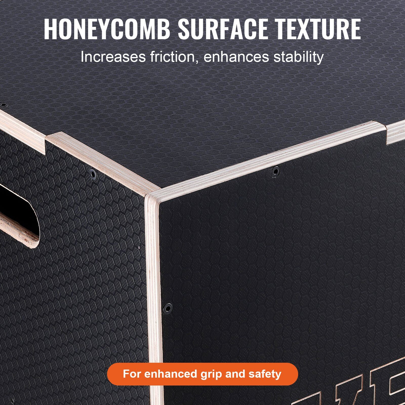 The plyo box is designed with multiple sanding processes for smoothness, rounded edges to prevent hand injuries, and portable handles for easy movement. The surface features a honeycomb pattern for slip resistance, offering stability and grip to ensure safe and effective workouts.
