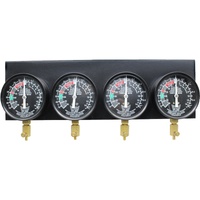 Upgrade vacuum carburetor set features 4 precision gauges with brass lockable valves. Each gauge has its own individual damping control and calibration control. Gauges are mounted to a heavy metal base intended for bench top use. The colored coded scales on the gauge is designed for easy reading.