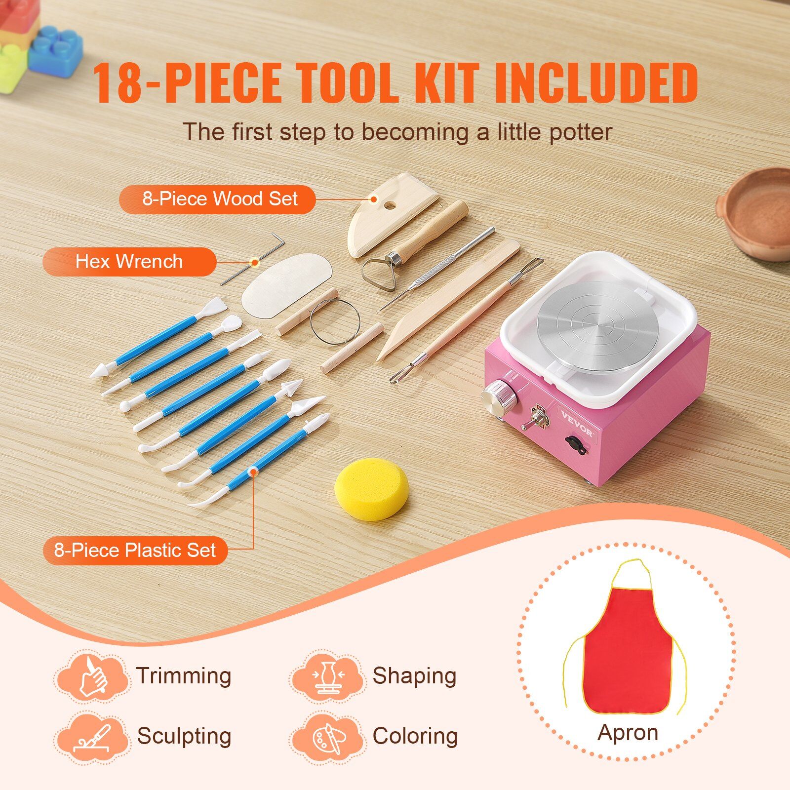 This ceramic wheel comes with a comprehensive set of tools, including an 8-piece carving set, an 8-piece plastic tool set, and a waterproof apron. It meets all your pottery DIY needs and is especially suitable for beginners.