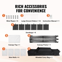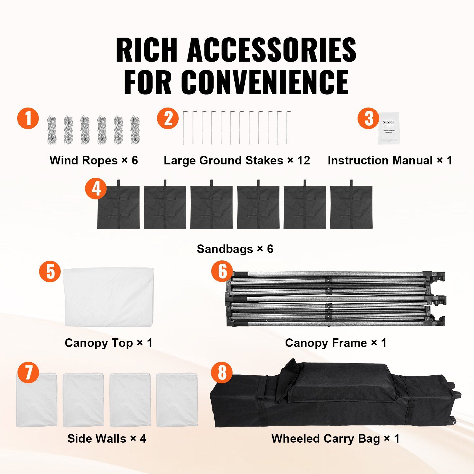 This 10x20 pop up canopy tent can be assembled in one minute, providing a temporary gathering place of 200 square feet. With three adjustable heights and a maximum internal height of over 9 ft, it offers a spacious standing room. This canopy with sidewalls comfortably accommodates 12-16 people, providing sun shade for a comfortable gathering.