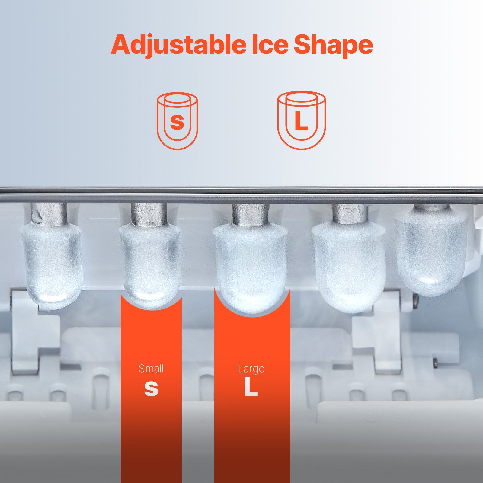 The countertop ice maker can produce 9 bullet ice cubes in just 6 minutes. With 1.3L / 1.37 QT of water in the tank, it can produce up to 26 pounds of ice within 24 hours.
