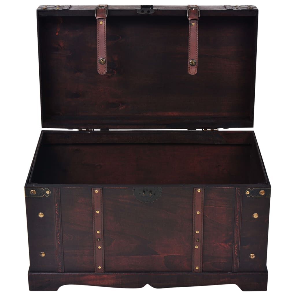 This beautiful antique-style wooden storage chest will not only make a striking decorative addition to your living room or bedroom decor, but also has ample space for keeping a wide range of items like clothes, magazines and books organised and out of sight. It has a convenient latch closure and is portable thanks to two side handles. Good to know: This treasure chest is for decorative use only not intended as a seat or step.