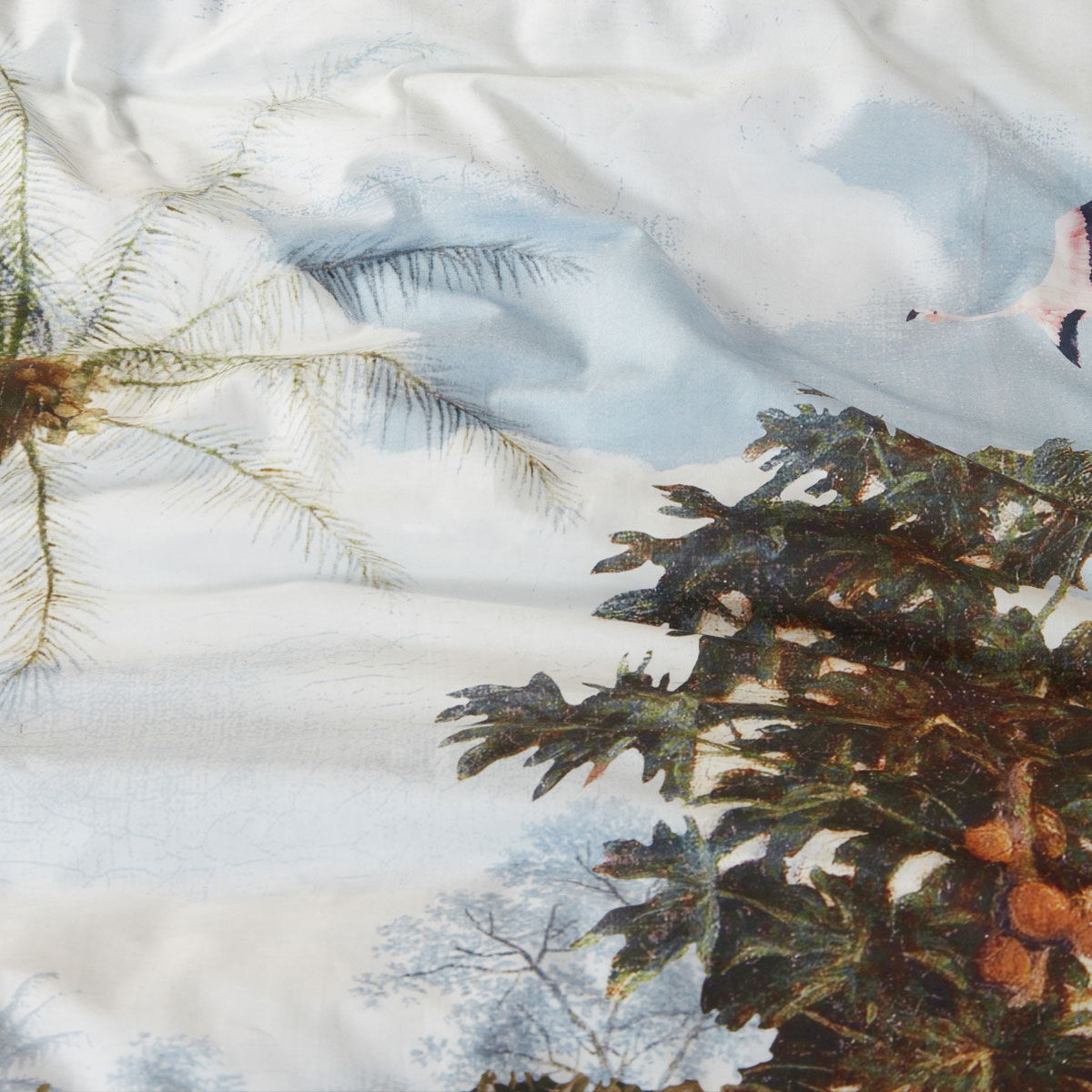 The Voyage Green Cotton Quilt Cover Set by Bedding House has a beautiful, digital print of an idyllic botanical landscape. The print shows a river flowing through the jungle with wild animals such as a flamingo, leopard, wild cat and birds on the river banks and between the trees. The landscape and the animals are brought to life through the use of warm colours such as white, teal, sky, black, brown, blue, olive, grey, and green. The back of the cover is plain grey-blue. It is made from high quality 100% Cotton fabric.