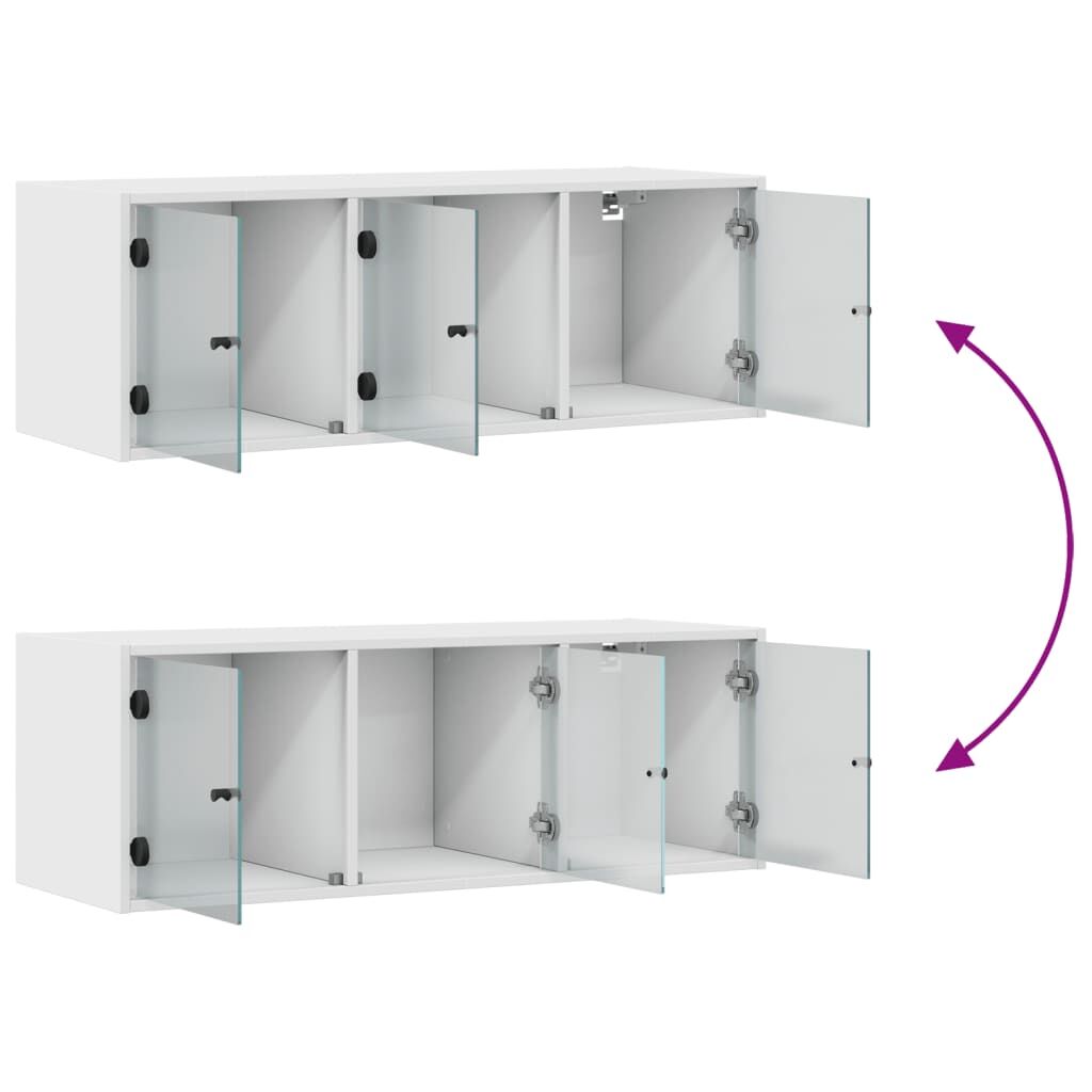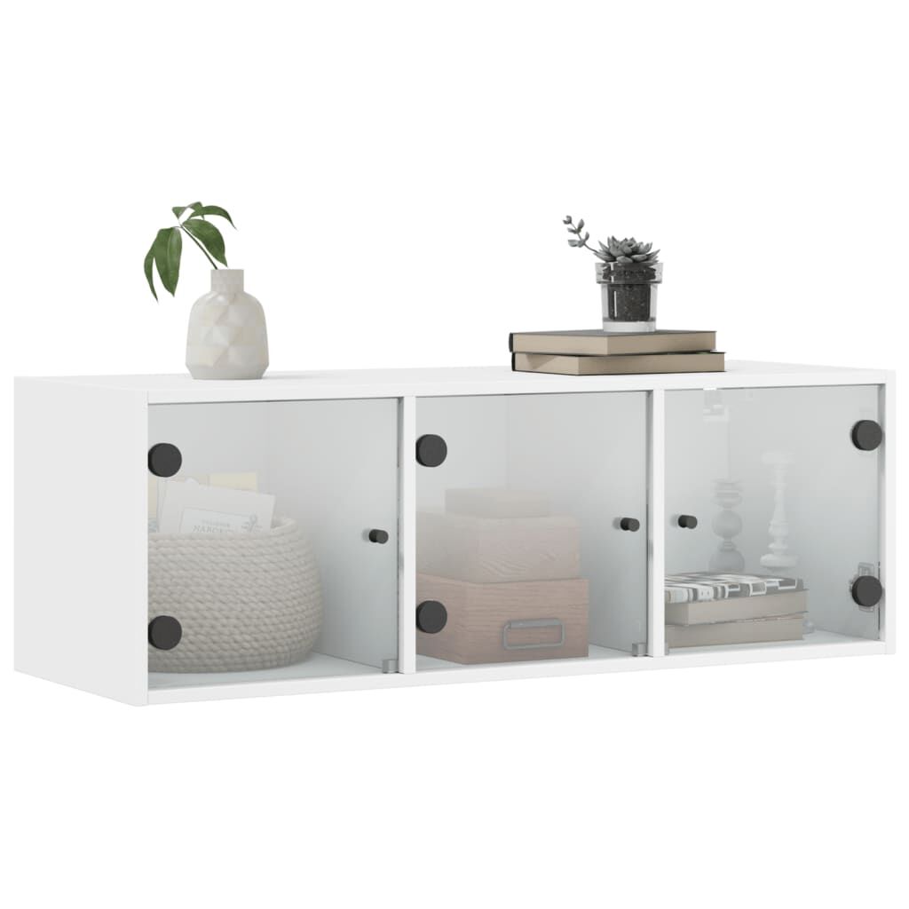 This wall cabinet is stunning and elegant. Not only is it an excellent solution for your chores and decorations, but it is also the perfect decoration for your empty walls and turns them into designer walls. Durable material: The engineered wood is of exceptional quality with smooth surface and also features strength, stability and resistance to moisture.Ample storage space: The hanging cabinet boasts compartments, enabling you to place items such as books, and keep them neatly organised and within reach.Versatile design: You can mount the storage cabinet on the workplace wall for convenient storage of tools or other miscellaneous items. Also, it transforms an empty wall into a design feature.Wall-mounted function: The storage cabinet can be wall-mounted to add extra storage space. That way, you can maximise your floor space and keep the area clean.Practical glass doors: Keep your space clutter-free by hiding small essentials behind the doors of the wall unit. In addition, the glass doors allow you to see inside the floating cabinet to display items beautifully. Good to know:Screws and plugs for inside the wall are not included. We advise to find and use screws and plugs suitable specifically for your walls. If you're not sure, you can consult with a professional. Please read and follow each step of the instructions.