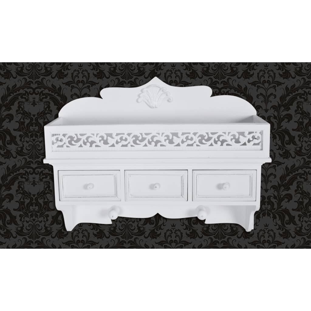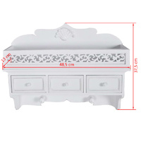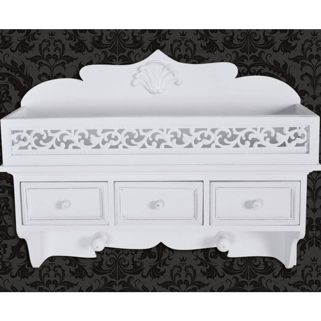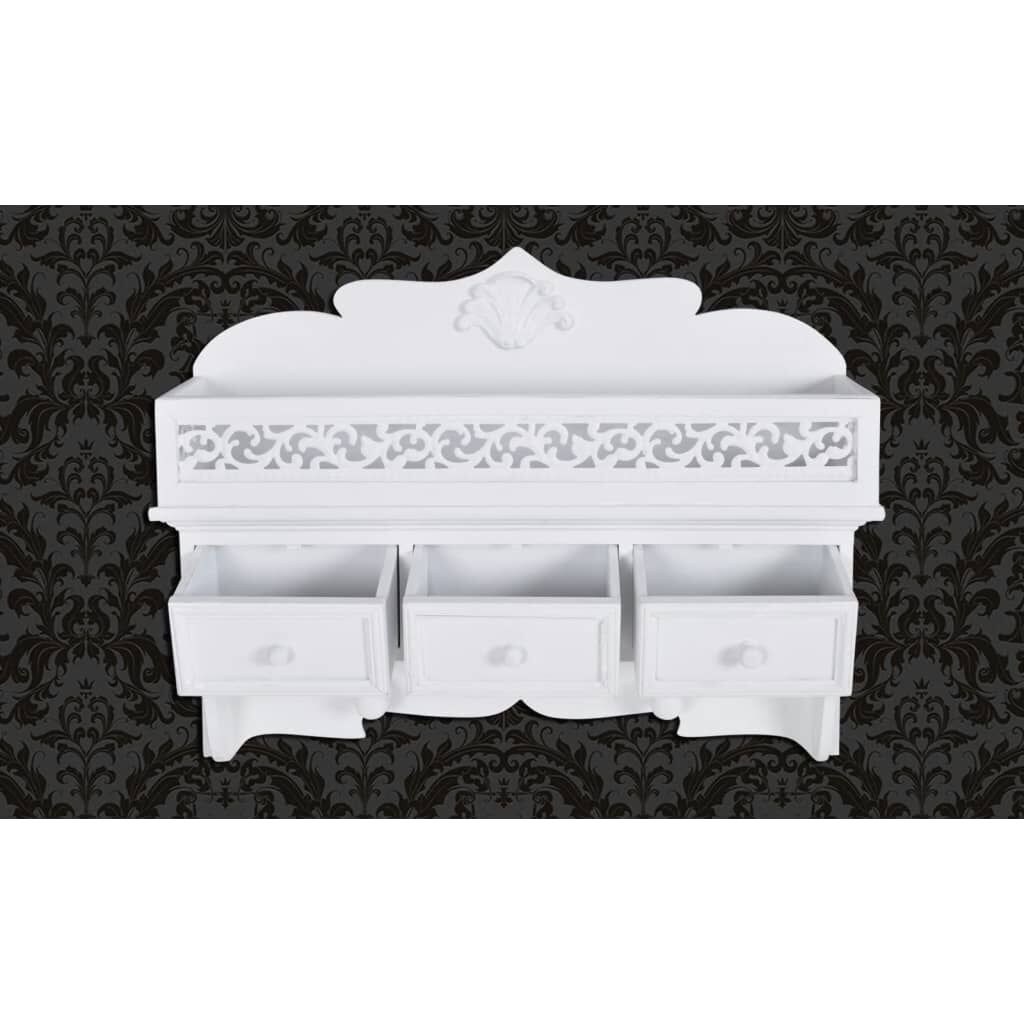 This classically elegant 3-drawer white wall shelf is the perfect all-in-one solution for small bedrooms or guest rooms that need some additional storage.Made of high density fiberboard (MDF), the drawers slide smoothly on nylon glides with built-in safety stops. They can also be easily removed for cleaning or moving.It also features two solid hooks underneath the drawers for hanging jacket, hat or handbag,etc.This classically elegant 3-drawer white wall shelf is the perfect all-in-one solution for small bedrooms or guest rooms that need some additional storage. It can also be used as a peg with two hooks underneath. It is made of high density fiberboard (MDF) and the drawers slide smoothly on nylon glides with built-in safety stops. They can also be easily removed for cleaning or moving.It also features two solid hooks underneath the drawers for hanging jacket, hat or handbag,etc. Note: Since this furniture is hand-crafted, made of wood and painted white, it may come with a small defect.