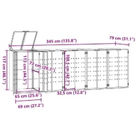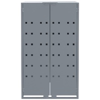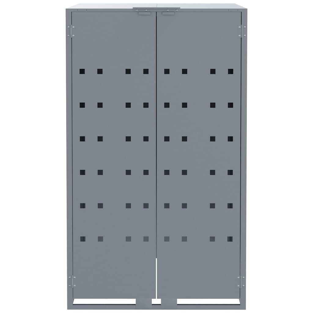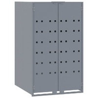 This wheelie bin storage discreetly hides your garbage bins in the garden, transforming your outdoor space into a beautiful and tidy environment. Strong and durable material: The powder-coated steel provides strength, stability, durability, and resistance to corrosion and harsh weather conditions, ensuring long-lasting performance.Practical lid mechanism: The gas-spring lid comes with a bungee cord that connects your bin's lid to it, so the bin lid opens automatically when you lift the lid of the bin store.Easy access: The front doors with magnetic closures make it a breeze to remove and replace the bins, ensuring waste disposal is effortless.Good ventilation: These vents on the panels promote air circulation, preventing odour buildup and keeping your bins fresh.Flexible design: You can enlarge your bin shed to accommodate more bins by adding extra extensions. These extensions are available for individual purchase at the store.