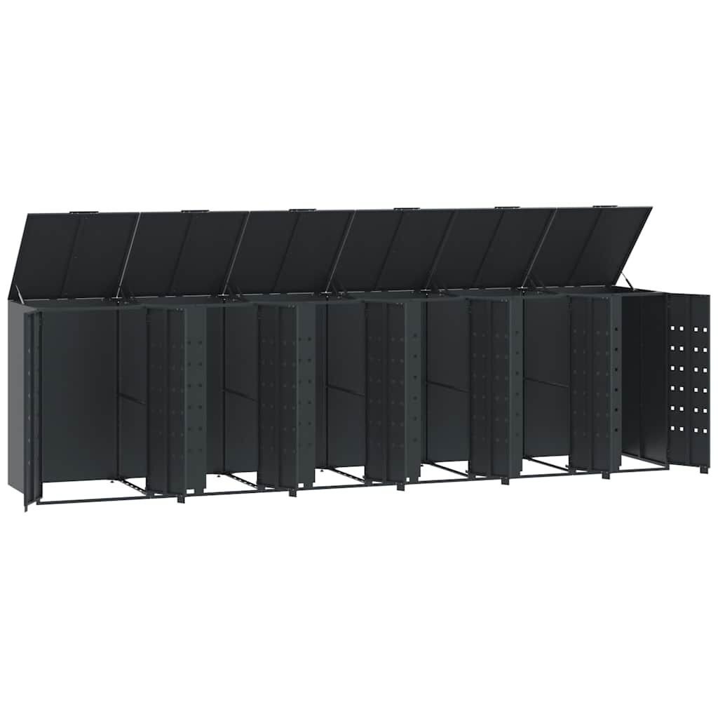 This wheelie bin storage discreetly hides your garbage bins in the garden, transforming your outdoor space into a beautiful and tidy environment. Strong and durable material: The powder-coated steel provides strength, stability, durability, and resistance to corrosion and harsh weather conditions, ensuring long-lasting performance.Practical lid mechanism: The gas-spring lid comes with a bungee cord that connects your bin's lid to it, so the bin lid opens automatically when you lift the lid of the bin store.Easy access: The front doors with magnetic closures make it a breeze to remove and replace the bins, ensuring waste disposal is effortless.Good ventilation: These vents on the panels promote air circulation, preventing odour buildup and keeping your bins fresh.Flexible design: You can enlarge your bin shed to accommodate more bins by adding extra extensions. These extensions are available for individual purchase at the store.