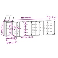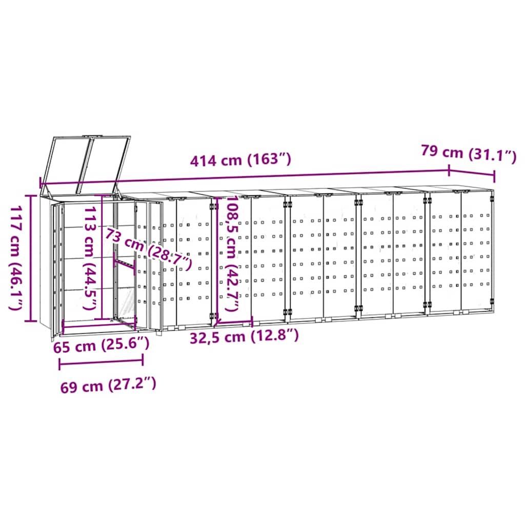 This wheelie bin storage discreetly hides your garbage bins in the garden, transforming your outdoor space into a beautiful and tidy environment. Strong and durable material: The powder-coated steel provides strength, stability, durability, and resistance to corrosion and harsh weather conditions, ensuring long-lasting performance.Practical lid mechanism: The gas-spring lid comes with a bungee cord that connects your bin's lid to it, so the bin lid opens automatically when you lift the lid of the bin store.Easy access: The front doors with magnetic closures make it a breeze to remove and replace the bins, ensuring waste disposal is effortless.Good ventilation: These vents on the panels promote air circulation, preventing odour buildup and keeping your bins fresh.Flexible design: You can enlarge your bin shed to accommodate more bins by adding extra extensions. These extensions are available for individual purchase at the store.