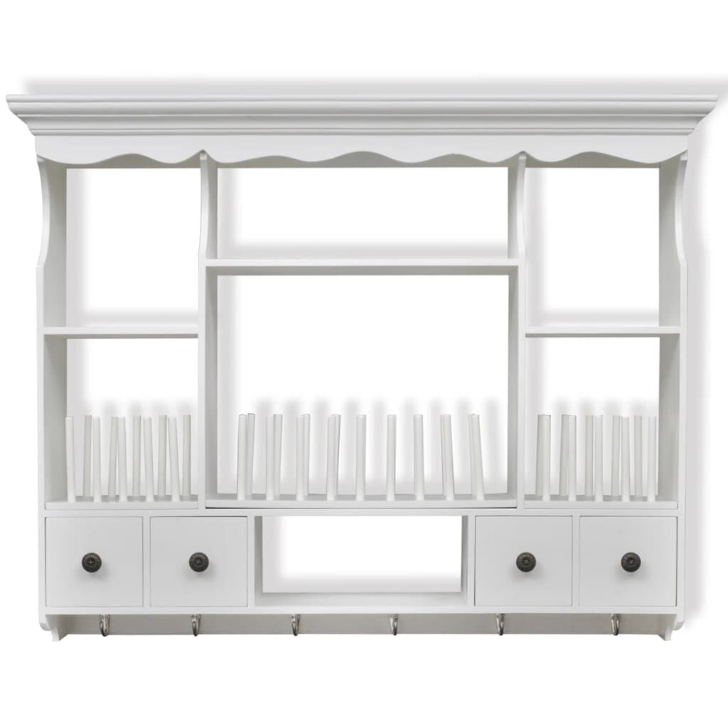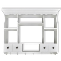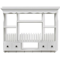 This elegant wooden wall cabinet in antique look offers plenty of storage and organisational options for virtually any kitchen, and will help to keep your kitchen neatly organised. The cabinet has four drawers and four shelves, allowing you to easily store cereal, spices, snack foods, canned goods and much more. The pegs keep your plates and dishes in place. The drawers are easily opened, so you can quickly get the things you need. It is equipped with hooks, for hanging mugs or towels. Made from high quality wood, this cabinet is designed to withstand a humid environment. The white paint finish makes it easy to clean with a damp cloth.
