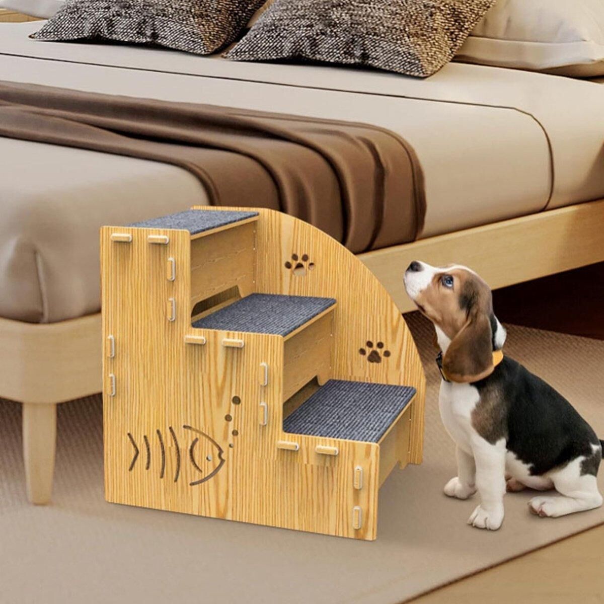 Provide your pet with the perfect solution for reaching higher spots with this stable and durable wooden pet climbing ladder. Designed with three non-slip steps and environmentally friendly materials, it provides stable and comfortable support for pets of all sizes. The anti-slip carpet strips on each step provide added traction, making it ideal for older pets or those with joint issues. Its compact design fits seamlessly into your home while allowing easy assembly and storage.