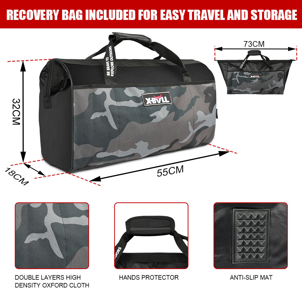 The X-BULL Recovery Kit is equipped with a 7/8 inch x 30 ft towing rope, 2 Spectra fiber soft shackles 3/8 "x 22" (34000 pounds), 3 inch x 8 ft trailer strap (30000 pounds), 1 pair of heavy gloves and 1 storage bag. Oh, and a set of stickers. X-BULL power recovery rope is made of double-woven high-quality nylon. The wire rope is coated with high wear-resistant polymer to prevent ultraviolet rays, water and abrasion, and the eye ring connecting the fixing point is immersed in a thick protective rubber coating to ensure that the service life is extended at the most important place.