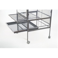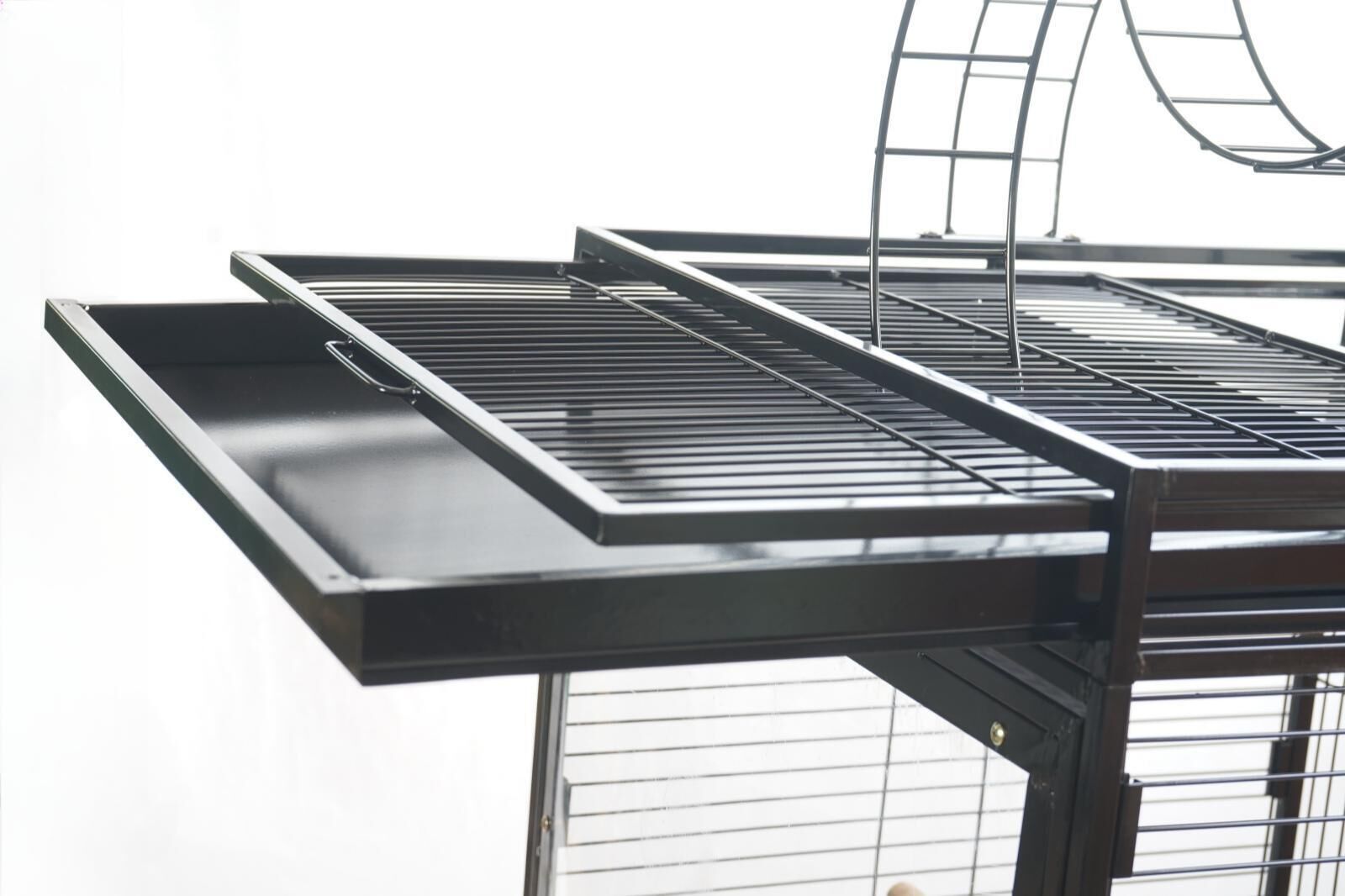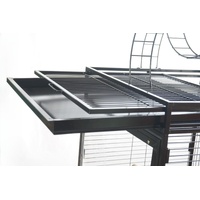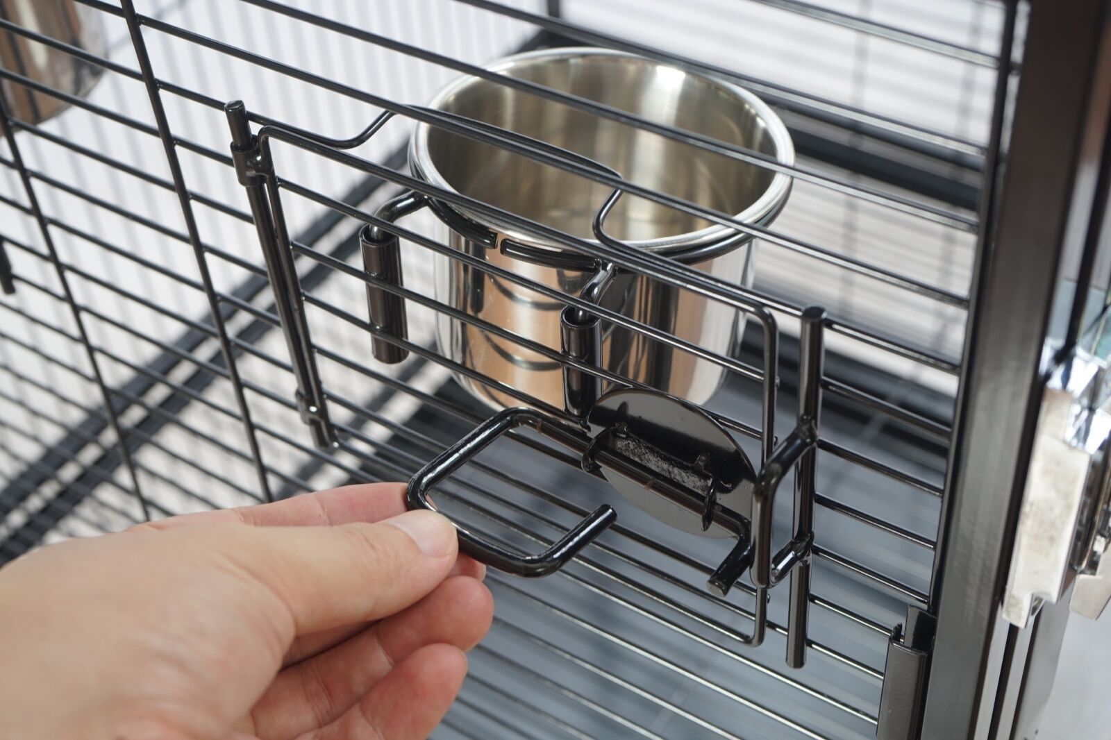 Taking care of birdis made easywith one large access door and two side doors to reach inside the five food and water bowls and take them out for refillingor cleaning. Cleaning is hassle-free with the slide-out top and bottom tray that can also be removed.